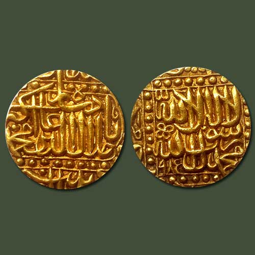 This gold mohur was issued by Mughal Emperor Abu'l-Fath Jalal-ud-din Muhammad Akbar during his rule ...