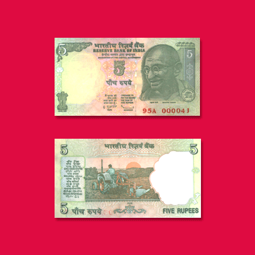 The five rupees features Farmer tilling a field with a tractor and in backdrop sunset can be seen to...