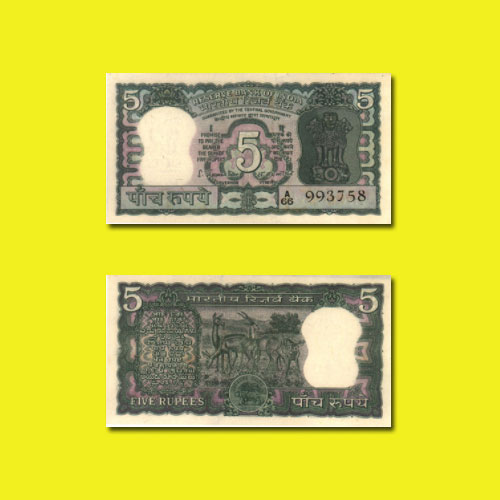 The reverse of the five rupee note features, 4 Deer, translated ‘5 Rupees’ in 13 different langu...