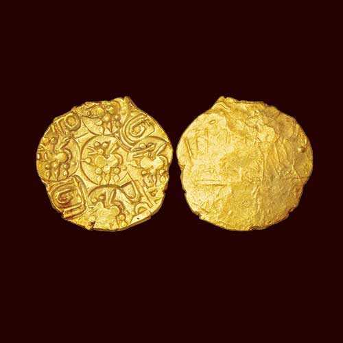 This gold Punch marked coin of Chalukyas of Kalyani, issued in the name of ‘Ayyana Singa’ during...