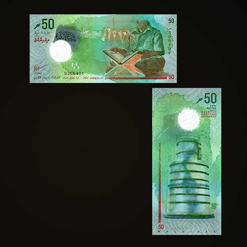 This Maldivian rufiyaa note was re-issued in 2022 as part of the 2015-2022 issue series.