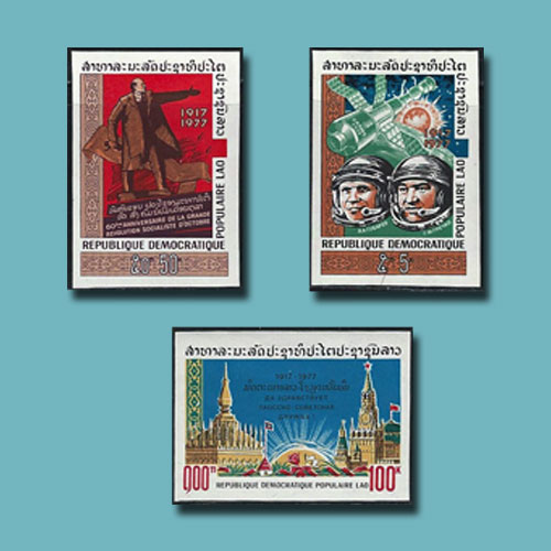 Laos Post issued a set of 6 stamps with three primary designs on 25th October 1977 to commemorate th...