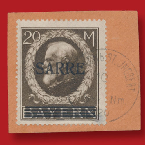 The rare Saar 1920 20-mark stamp of King Ludwig III is auctioned by Christophe Gaertner Auctions. Th...
