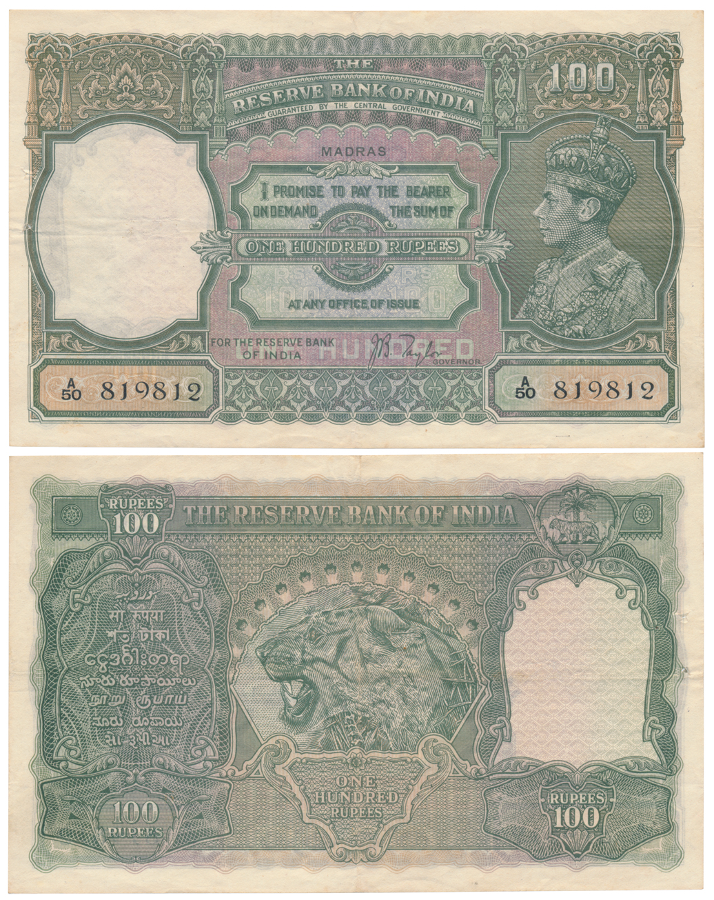 Todywalla Auction is offering the hundred rupee note depicted King George VI portrait in the Vignett...