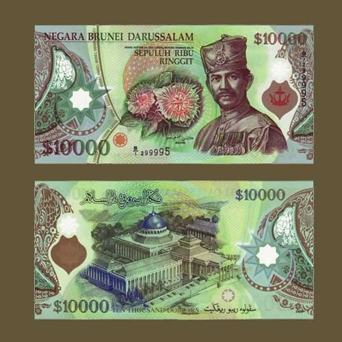 Brunei’s B$10,000 note has a market value of $7,482. The note features a portrait of Sultan Hassan...