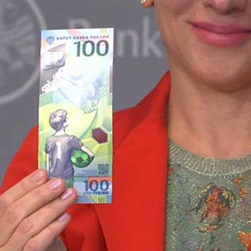 A new vertically designed 100-ruble commemorative FIFA banknote celebrating the 2018 World Cup was r...