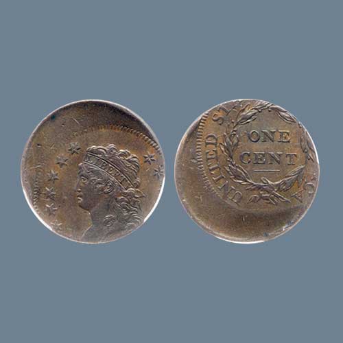 An Undated (1808) Classic Head cent, struck 30 percent off centre, graded AU-55 was sold for $6,462....