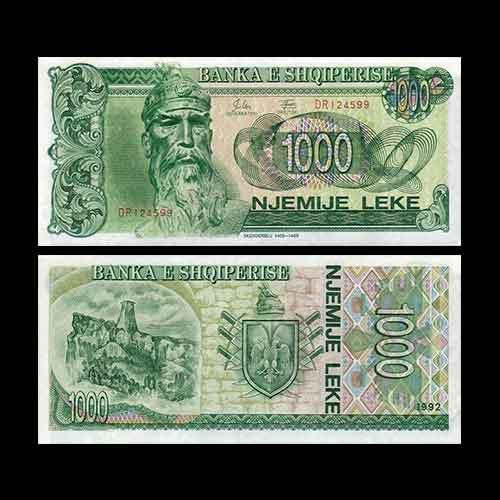 The Banka E Shqiperise issued 1000 Albanian Lek banknotes that depict Albanian nobleman Skanderbeg i...