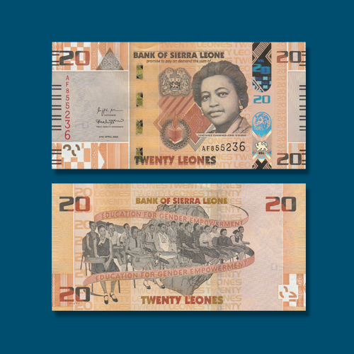 The brown, black, and orange banknote features the smiling portrait of Constance Cummings-John on the front along with a coat of arms and laurels flanking an open book with flame. The reverse of the banknote features a crowd of 16 students seated at school desks with a map of Sierra Leone in the background with the text “Education for Gender Empowerment” on top and right.