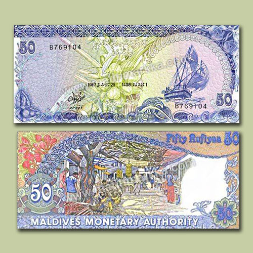The currency of the Maldives id Rufiya, derived from the Sanskrit “rupya” or the India currency “Rupee”. Notes for 1?2, 1, 2, 5 and 10 rufiyaa were printed and put into circulation on 5 September 1948. In 1951, 50 and 100 rufiyaa notes were introduced. The current series of banknotes was issued in 1983 in denominations of 2, 5, 10, 20, 50 and 100 rufiyaa. 500 rufiyaa notes were added in 1990, with the 2 rufiyaa replaced by a coin in 1995.