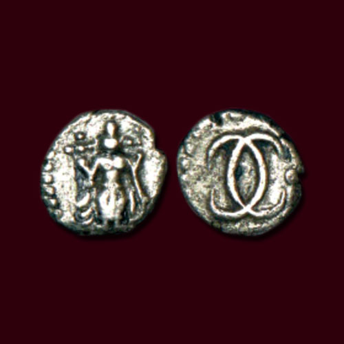 The coin showed in the image alongside is a 0.91 g silver Fanam. The obverse has a standing figure of Lord Vishnu and the reverse has the standard design of two interlinked CS, with one dot, surrounded by a beaded border.