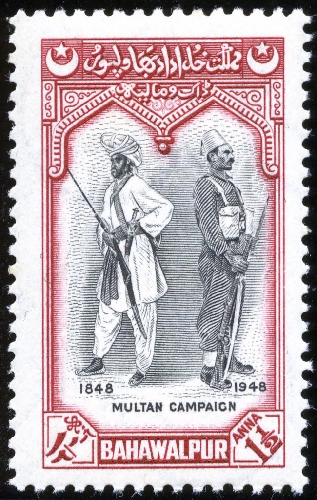 On 15th October 1948, Bahawalpur issued a very significant stamp commemorating the 100th year of the Multan Campaign. Also known as the Siege of Multan, the Multan Campaign was a prolonged contest between the city and state of Multan and the British East India Company. The siege lasted between 19 April 1848 and 22 January 1849, when the last defenders surrendered.