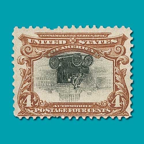 This stamp illustrates an electric automobile also known as Electric Vehicle service. The image of this vintage vehicle was taken from the Baltimore & Ohio Railway brochure. The person shown in the stamp was a B&O passenger agent, so this stamp actually depicts a living person by violating the law thus making this rare philatelic item even more intriguing.