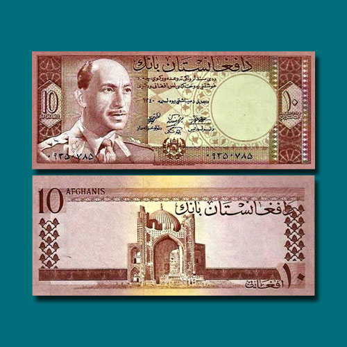 The Bank of Afghanistan (Da Afghanistan Bank) is issuing paper money since 1939, issuing notes for 2, 5, 10, 20, 50, 100, 500 and 1000 afghanis. The 2 and 5 Afghani notes were replaced by coins in 1958. In 1993, 5000 and 10,000 Afghani notes were introduced. Today we are discussing a 10 Afghani banknote of 1340 (1961). The note specifications are as follows: