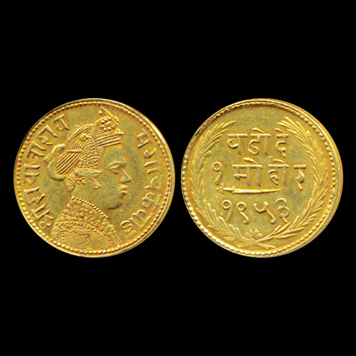 This gold mohur was issued by Sayaji Rao III of Princely State Baroda. Sayaji Rao III belonged to the royal Gaekwad dynasty of the Marathas which ruled parts of present-day Gujarat. He was a Maharaja of Baroda State from 1875 to1939.Sayaji Rao III issued coins in gold, silver, and copper, during his reign. These coins were struck from Baroda and Amreli mints. The denominations are Mohur, Rupee, Paisa, Annas, Pai etc.