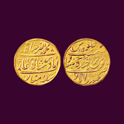 The coin depicts beside is 11.15 g gold Mohur of Sikandar Jah struck at the Hyderabad mint in AH 1237. This Very Rare coin has Persian legend ‘Sikka Mubarak Muhammad Akbar Shah Badshah Gazi’ with AH date 1236 and letter ‘Seen’ for Sikandar on its obverse. The reverse has the mint name, julus formula and RY date which read as ‘Zarb Farkhanda Bunyad Hyderabar Sanah 16 Julus Mainamat Manus’.