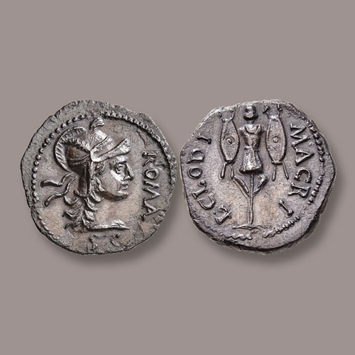 Macer issued seven main types of coins and none of them featured his portrait. However, the latest issue featured the genitive in his name. His coinage never depicted imperial titles and featured “S C” meaning Senatus Consulto, or “with permission of the Senate”. The coin designs were crude and poor in quality.