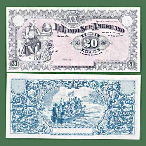 The note depicted beside is a 20 Sucre banknote of 1920. The obverse depicts Christopher Columbus, while the reverse features the landing of Christopher Columbus in the New World.