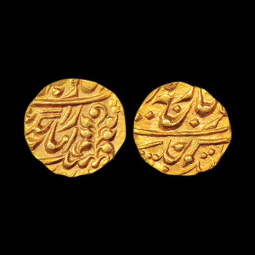 Kishangarh was a Princely State located in the center of Rajputana. It was founded by Jodhpur Prince Kishan Singh in the year 1609 AD. Before Kishan Singh, the state was ruled by Maharaja Samokhan Singh who was a relative of Kishan Singh’s family.Rulers of Kishangarh issued various gold and silver coins. These coins were first issued in the name of Mughal Emperor and later British rulers. Depicted here is a gold Mohur issued in the reign of Yaghanarayan Singh. He ruled the state from 1926 to 1938 AD.