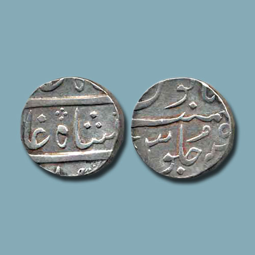 Depicted above is a silver Rupee issued in the reign Imtaya-ud-Daula. This coin was issued in the name of Shah Alam. The obverse of a coin has a name of Shah Alam while reverse depicted with RY date, Mint name and Julus formula.