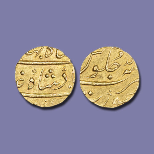 This gold mohur was issued by Shah Jahan III from the mint surat weighs around 11.12g. The obverse of this coin is inscribed with the name and title of the king Shah Jahan III. The reverse of this coin is inscribed with the mint name Surat. This gold mohur was sold for INR 1,20,000 in an auction of Todywalla held in Mumbai on 29th June 2017.