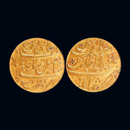 This gold mohur minted in Murshidabad weighs around 12.36g was issued in the name of Mughal Emperor ...