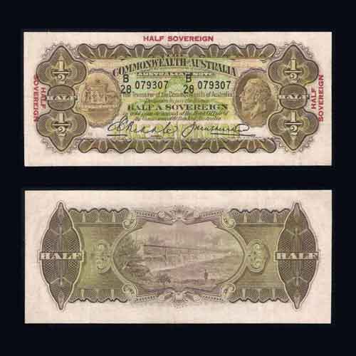 The image beside depicts an Australian Ten Shillings banknote issued in 1927 with an overprint "Half...