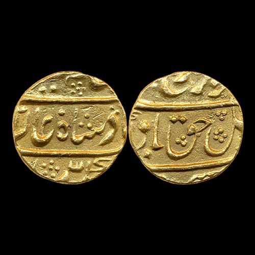 This gold mohur weighs 8.6g, it was sold for INR 75,000 by Towywalla Auction. This coin is a mule co...