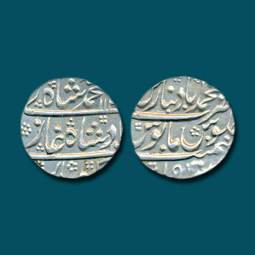 This silver rupee was issued by Mughal Emperor Muhammad Shah during the 15th year of his reign. The obverse of this coin is inscribed with the name and title of the king. The reverse of this coin is inscribed with the mint name.