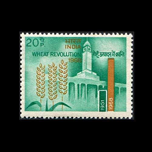 On 17 July 1968, India Post commemorated the Wheat Revolution by issuing a stamp that celebrated the remarkable achievements of the Green Revolution. This stamp, unveiled by former Prime Minister Indira Gandhi, features imagery of wheat stalks with the IARI in the background, alongside bar graphs illustrating production growth from 1951 to 1968.