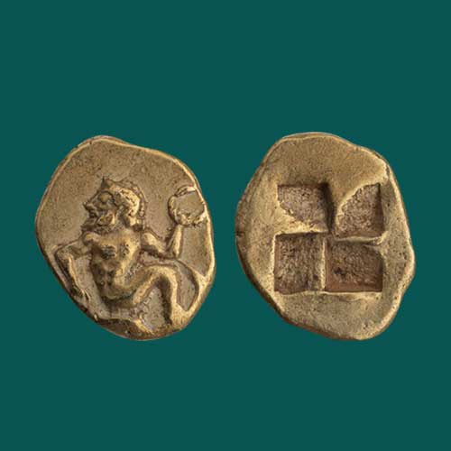 The #COIN featured in this post is an electrum Hekte from Cyzicus, showcasing Triton holding a wreath, with a tuna fish depicted below. The reverse showcases a swastika pattern / quadripartite incuse square.