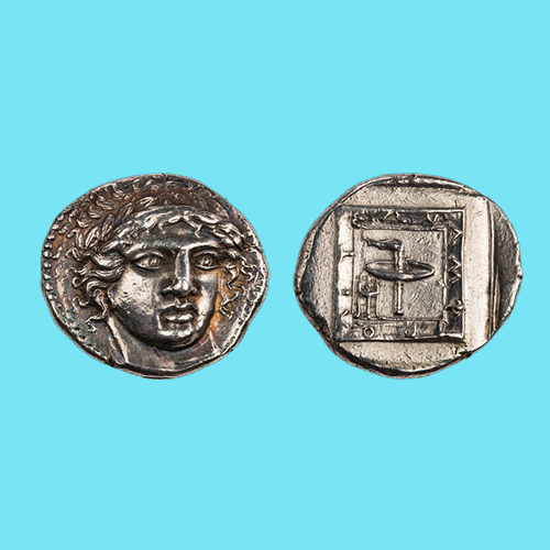 While the majority of coins depicting Apollo showcase side-profile portraits, a limited number do present frontal profiles. One noteworthy example is the Silver Tetradrachm from Amphipolis, an important ancient Greek city in northern Greece, minted between 410 BCE - 357 BCE. The obverse of this coin features a bust of Apollo adorned with a laurel wreath, while the reverse showcases a lit Racing torch and a Delphic tripod within a square, inscribed with "AMPHIPOLITEON" in Greek.