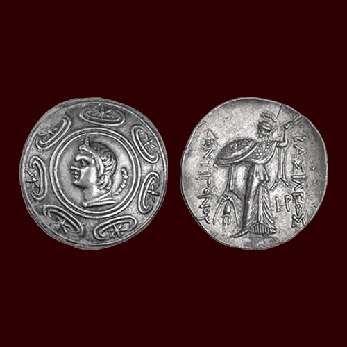 The reverse features Athena Alkidemos (an epithet meaning defender of the people) holding a shield in her right hand and a thunderbolt in her left. A Macedonian helmet is depicted beneath her right hand, with a monogram below her left. The Greek inscription reads BASILEOS ANTIGONOU, translating to "of #king Antigonus."
