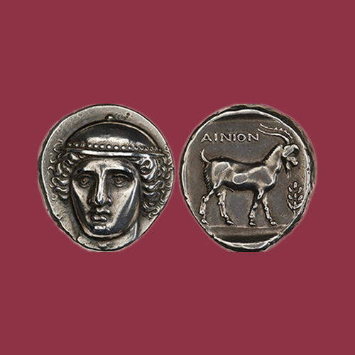 Hermes’ image has been featured on #Coins since 477 BCE, wearing a petasus. The coin featured in this post is a #silver Tetradrachm from Aenus, dating back to 405 BCE - 357 BCE. Aenus or Ainos in present-day #Turkey was an important ancient port established by the Greeks in the 7th century BCE. This particular coin weighs 15.81 grams, with the obverse showcasing a frontal #Profile bust of Hermes wearing a petasos. The reverse features a #GOAT positioned to the right with a #plant below, accompanied by a Greek inscription reading "AINION," which translates to "of the Ainians."