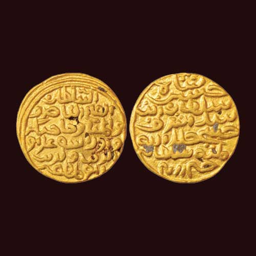 This Gold Tanka of Ala Al-Din Husain Shah which weighs around 10.62g, minted at Husainabad, is listed at INR 3,50,000 to 4,50,000 at Classical Numismatic Gallery. The obverse of the coin is inscribed with Persian legend ‘al-Sultan al-Fatih al-Kamru Wa al-Kamta wa Jajnagar wa Urisa Ala al-Dunya wa al-din Abu al-Muzaffar’. The reverse of the coin is inscribed as ‘Husain Shah al-Sultan ibn Said Ashraf al-Husaini Khallada Allah Mulkahu wa Sultanahu Husainabad’.