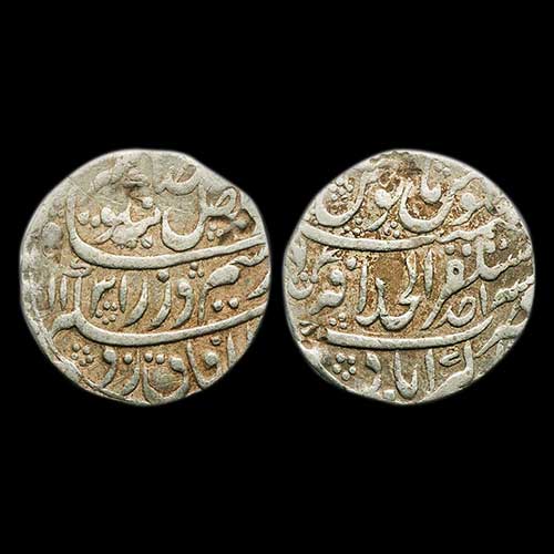 This extremely rare silver rupee of Nikusiyar which weighs around 11.28g was minted in 1131 AH. The obverse the coin is inscribed with the Persian legend ‘Dar Afaq Sikkah zad bar seem-o-zar ba-fazl khuda shah nikusiyar’ and AH year. The reverse of the coin is read as ‘Julus Mainamat Manus Zarb Mushtaqir Al Khilafa Akbarabad Sanah Ahad’.