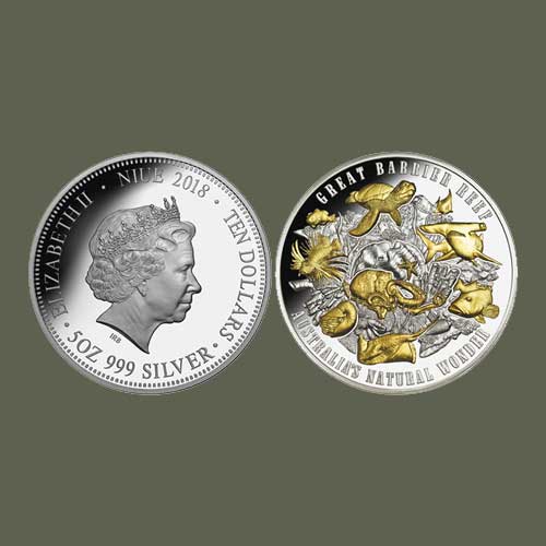 A new Proof .999 fine silver $10 Australian Coin was produced by a firm called Downies for the country of Niue, honouring the Great Barrier Reef. The reef is known for colourful corals and sponges. It is home to 1,500 species of fishes and 4,000 types of mollusk. Various whales, dolphins, the giant clam and the green sea turtle are spotted here.Different underwater creatures swimming in the Great Barrier Reef, like a green sea turtle, angelfish, hammerhead shark, starfish (sea star), grouper, octopus, manta ray, nautilus, lionfish, and clownfish are depicted in high relief on the coin. The 5-ounce coin also features 24-karat gold plating to highlight certain elements of the design.