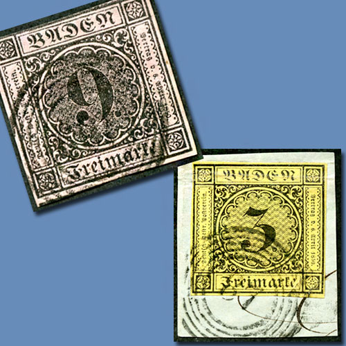 Located in southwestern Germany, Baden was a Grand Duchy and a member of the German Confederation. The State of Baden has existed since the 12th Century, but the Grand Duchy of Baden came into existence in 1806.The first German States stamps for the Grand Duchy of Baden appeared in May of 1851. The stamps were typographed, imperforate, and printed in black on pale buff, orange, blue-green, and deep rose papers with the denominations of 1Kreuzer, 3Kreuzer, 6Kreuzer and 9Kreuzer respectively.