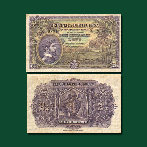 The banknote depicted alongside is a 2 and ½ angolares banknote issued in 1926. The obverse has the portrait of Paulo Dias de Novais at lower left, a Savanna landscape at right, and the Portuguese Coat of Arms at lower center. The Reverse has a Rhinoceros at center and the denominational value in ornate guilloches at left and right.