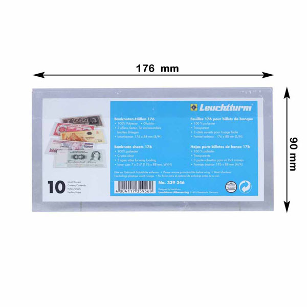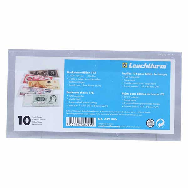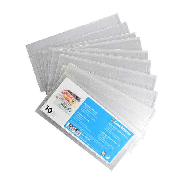 Sheets to protect banknotes. Made from 100% polyester and is acid free and plasticizer free.The pockets are open on 3 sides for easy loading of the banknotes without bending or crumpling them. Transparent pockets facilitates a clear view of both sides of the notes.