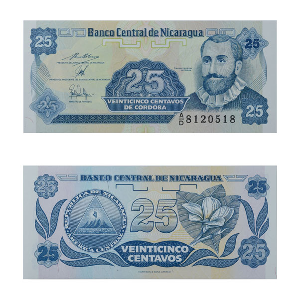: This is a 25 Centavos note of Nicaragua, a country located in Central American isthmus. It was issued in the year of 1991.