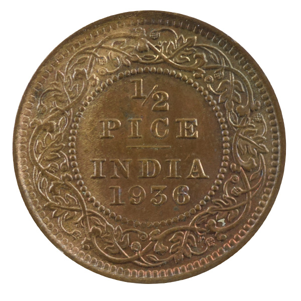 Reverse: 1/2 PICE INDIA 1936 within circle of beads, wreath surrounds.