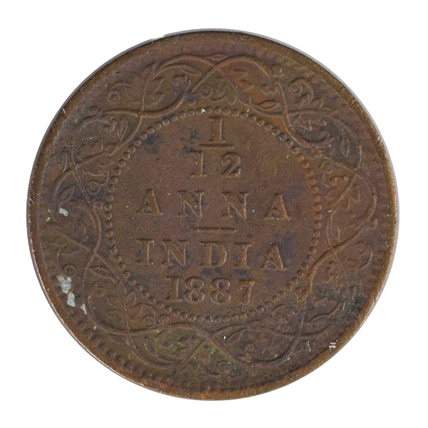Reverse: 1/12 ANNA INDIA 1887 within beaded circle and wreath.