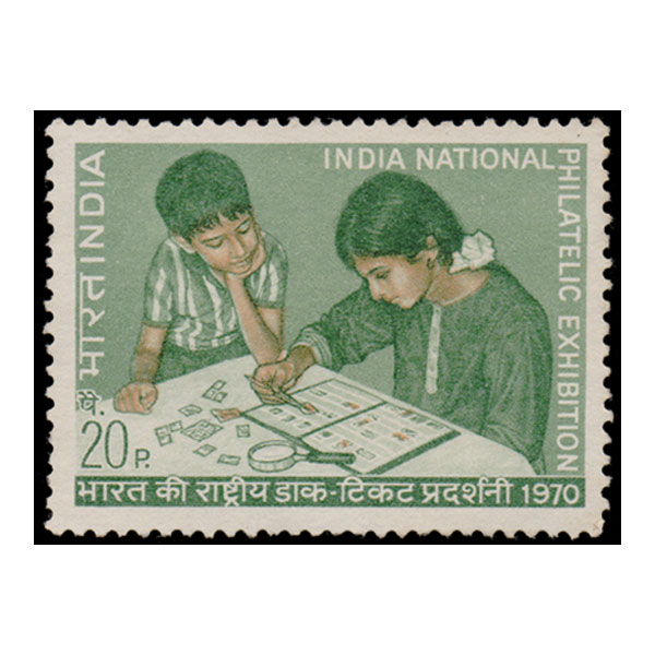 Indian National Philatelic Exhibition stamp was issued on the themes of stamp collecting. The picture shows young collectors - a boy and girl arranging stamps in a stockbook.
