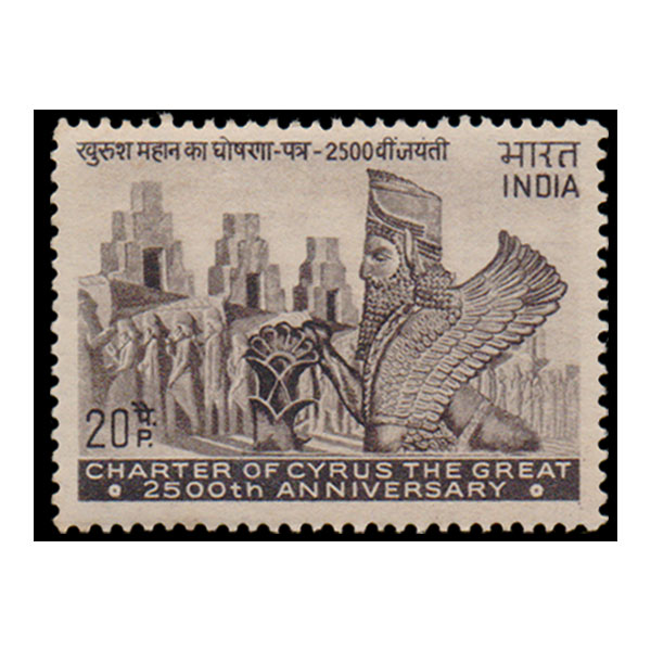 Cyrus was the first Achaemenid Emperor. He founded Persia by uniting the two original Iranian Tribes- the Medes and the Persians.The stamp is issued to commemorate his 2500th Anniversary which depicts a winged animal with animal face and stairway of the central palace.