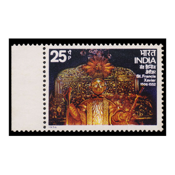 St. Francis Xavier's stamp shows the stone casket and statue of the saint. These are located in the Bom Jesus Church in Goa.