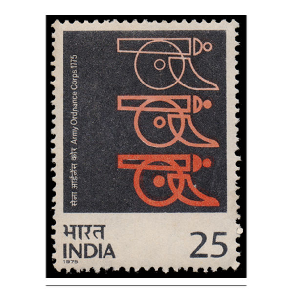 Bicentenary of Army Ordnance Corps. The stamp symbolises stylised form of a cannon varying thickness and colours.