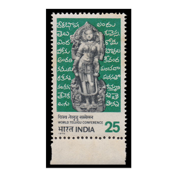 World Telugu Conference is a conference for furtherance of Telugu language. It was held for the first time in Hyderabad in 1975. The stamp shows an image of Goddess Saraswati (Goddess of learning) & inscriptions in Telugu.