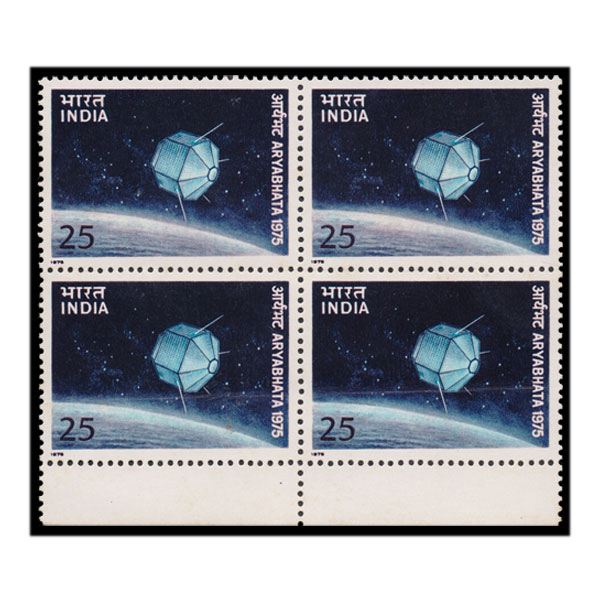 Aryabhatta was the first satellite, built by ISRO. It is named after the 5th century Indian Astronomer and mathematician.The stamp depicts diamond-shaped satellite in space.