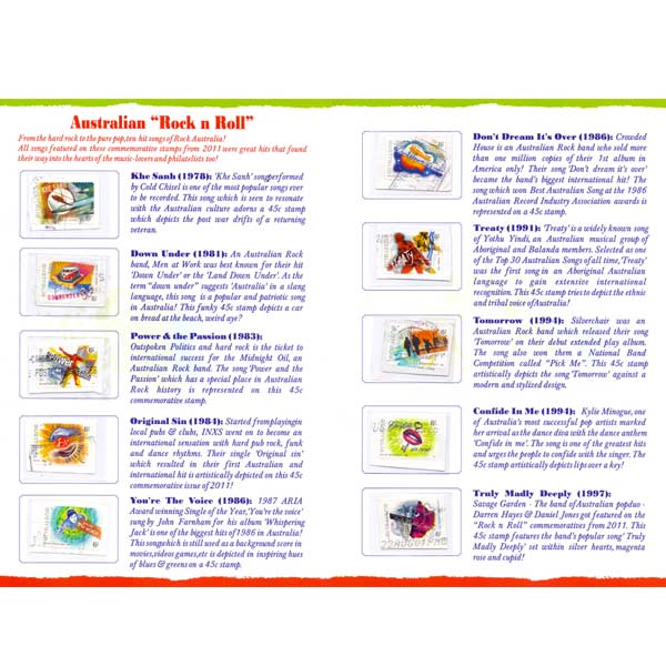 Music touches the soul. Here’s a Booklet of 10 Australian Stamps featuring the Hit Songs of the country Down Under. The booklet contains 10 commemorative stamps with information of the songs they depict. Be blown by the beauty of these Rock Music stamps! Color : MultiColor Product specification : 30 x 21.3 cm